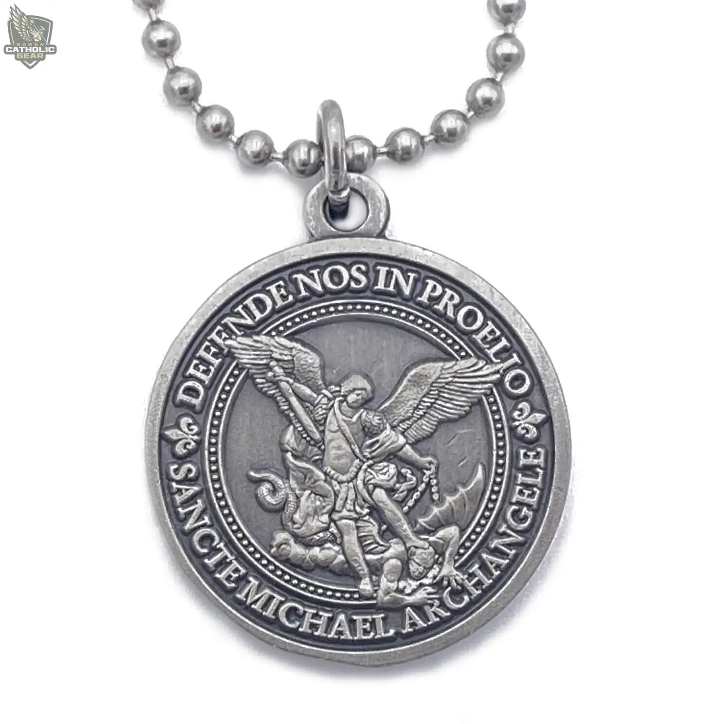 The front honors St. Joseph — Most Chaste, Terror of Demons — lilies surrounding his heart as a sign of purity and strength. The reverse bears St. Michael with the Latin charge “Defende nos in proelio” — Defend us in battle.